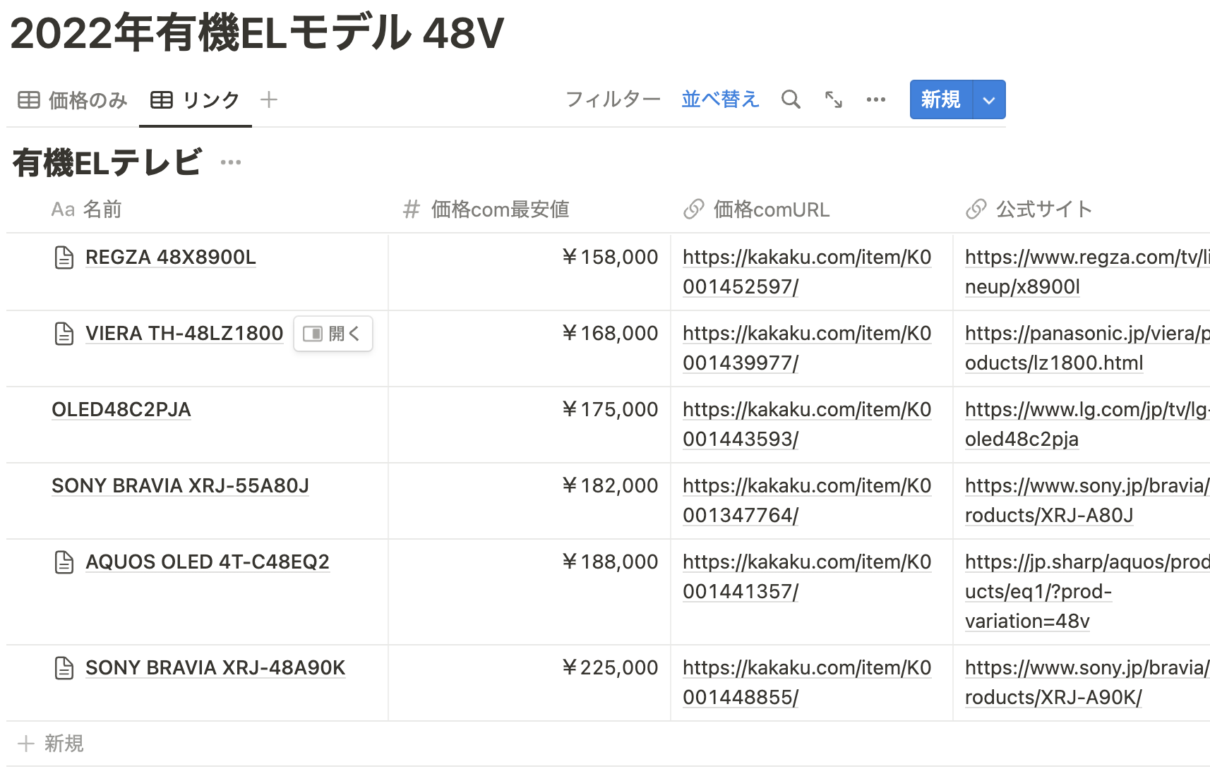 ある程度要件がまとまったので、条件にあったテレビを探します。 有機 EL テレビ・48 インチのものを価格.com で調べつつ Notion に候補をまとめていきました。