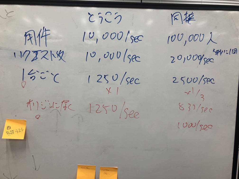 まずは、このリクエストを捌くには 1 台のサーバあたりどれだけの能力が必要かを試算することにしました。 クライアント側のポーリングの間隔やサーバの台数を考慮し、目標数を設定しました。
