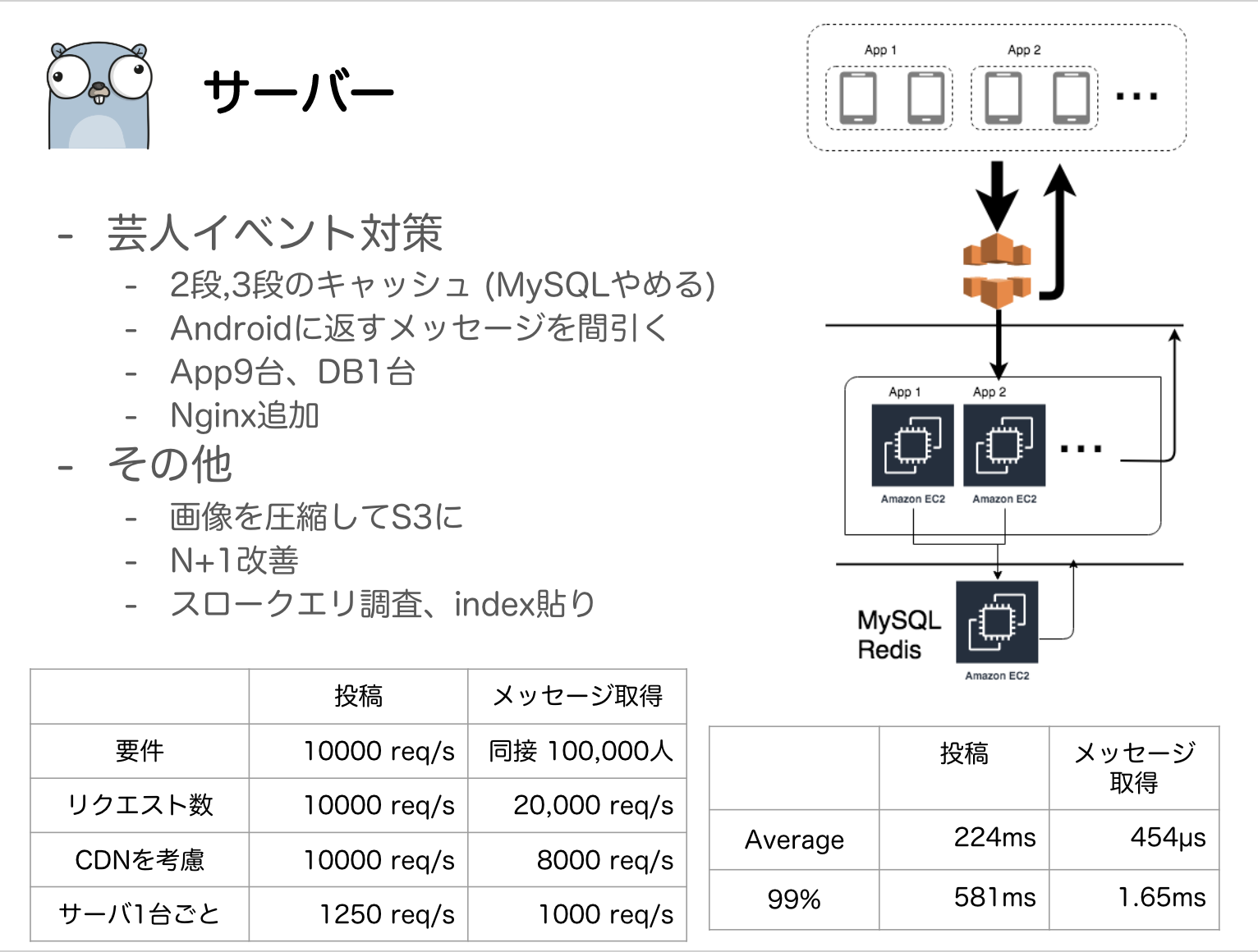 サーバサイドはインフラ構成や計測結果、その他工夫などを簡潔に 1 枚のスライドにまとめて発表しました。