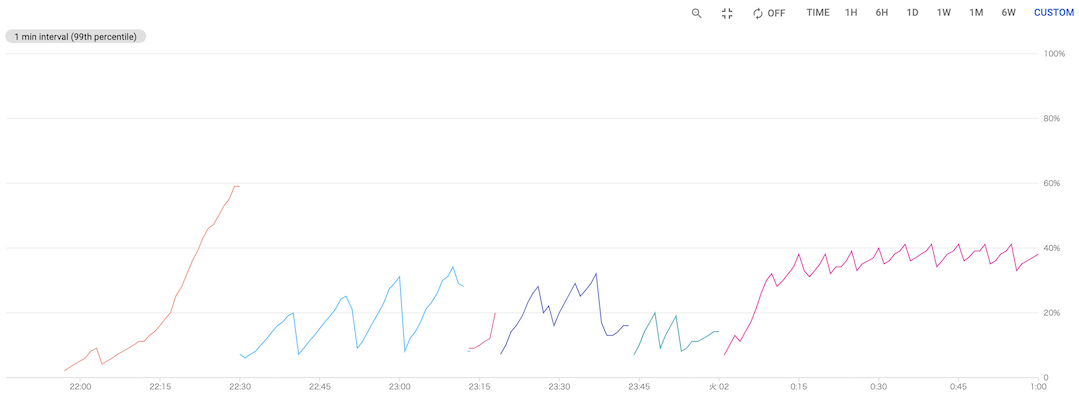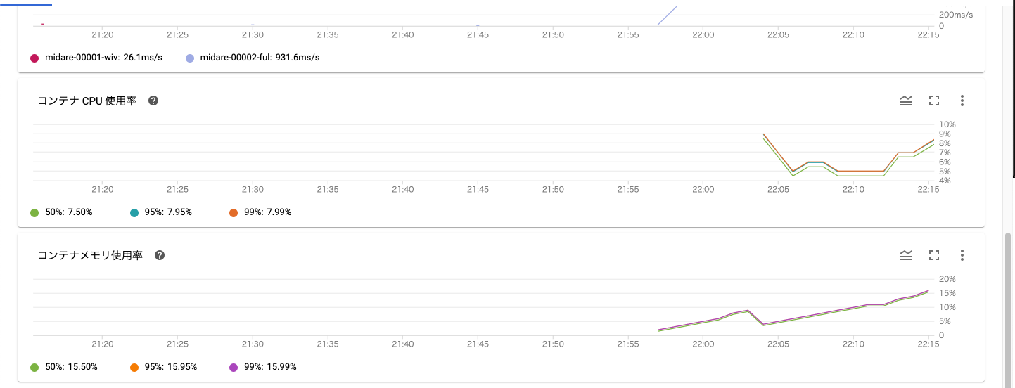 移行直後のメトリクスを見ればわかるように、メモリ使用率がどんどん上昇しています。これはツイート情報をオンメモリでキャッシュしているのが要因です。